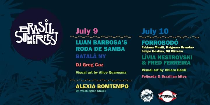 Forrobodó is a high-spirited music engagement delivered by NYC Brazilian musical heroes Fabiana Masili, Itaiguara Brandão, Felipe Hostins and Gil Oliveira. Lívia Nestrovski & Fred Ferreira is a special appearance by the the Rio de Janeiro based singer and guitarist who first debuted at Brasil Summerfest in 2017. This event features projected artwork on the Manhattan bridge by Rio based artist Chiara Banfi, curated by Gisela Gueiros.
